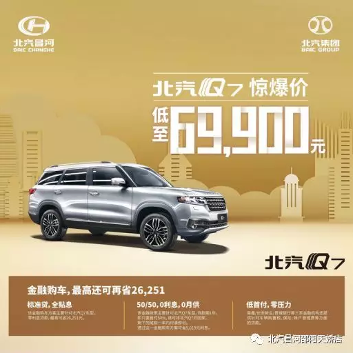 比如你现在购买一台北汽Q7,这款车目前全系最高优惠18000元,起步价仅需6.99万元。你可以选择北汽Q7专属金融方案——“50/50,0利息,0月供”贷款购买。首付仅需3.5万元,不需要利息和月供,一年后再付清剩下的尾款即可。这样你不止可以提前享受有车生活,提高家庭的生活品质,也让银行承担了你的人民币贬值损失,岂不快哉?