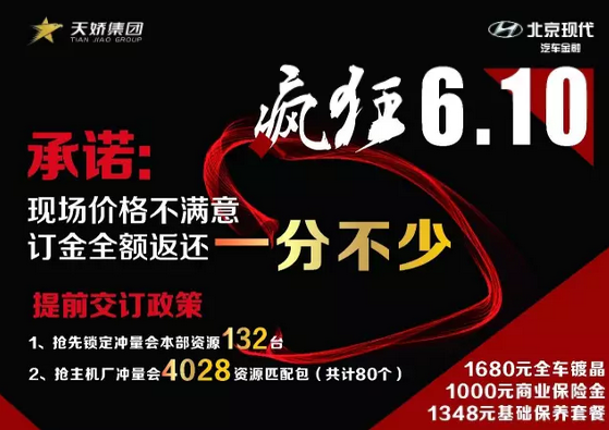 天娇集团特批75万现金,北京现代提供132台厂方本部资源 —— 厂方承诺:‘只要销量,不谈价格’现场价格不满意