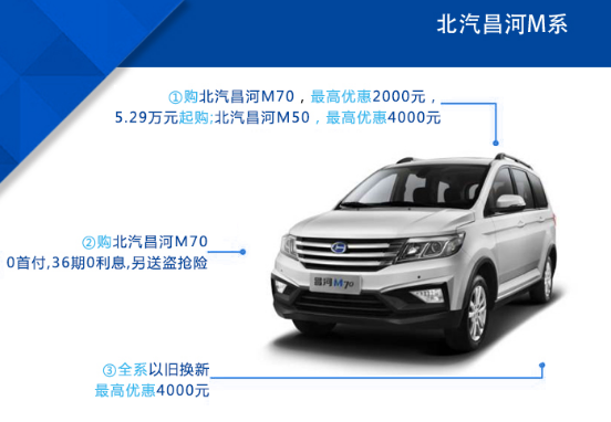金秋十月,温馨钜惠,北汽昌河为匆忙的你特此带来多款暖心好车,让全家人的出行更安全,更舒适,更经济实惠。即日起,凡购买北汽昌河M70,可享0首付,36期0利息的超值大优惠,另送盗抢险。购买M50,最高立享优惠4000元。