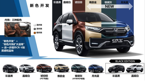 配色方面,新款本田CR-V除了新增了雅韵金、银黛灰(混动车型专属)、月光蓝三种外观配色之外,还有个性十足的Black Edition车型(包括彩晶黑、晶耀白两种配色)可供选择,该车型有专属标识。