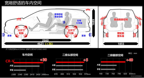 此外,新车的车身尺寸相比以往也有所提升,新款本田CR-V两驱版车型的长宽高分别为4621/1855/1679mm,轴距为2661mm,四驱版车型的长宽高分别为4621/1855/1689mm,轴距为2660mm。