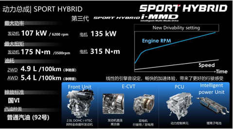 混动版车型搭载的是本田引以为傲的第三代i-MMD混合动力系统,其中2.0L阿特金森循环发动机的最大功率为107kW,最大扭矩为175N•m,电动机的最大功率为135kW,最大扭矩为315N·m;与之匹配的是E-CVT变速箱。燃油版及锐·混动版均有四驱系统可选择。