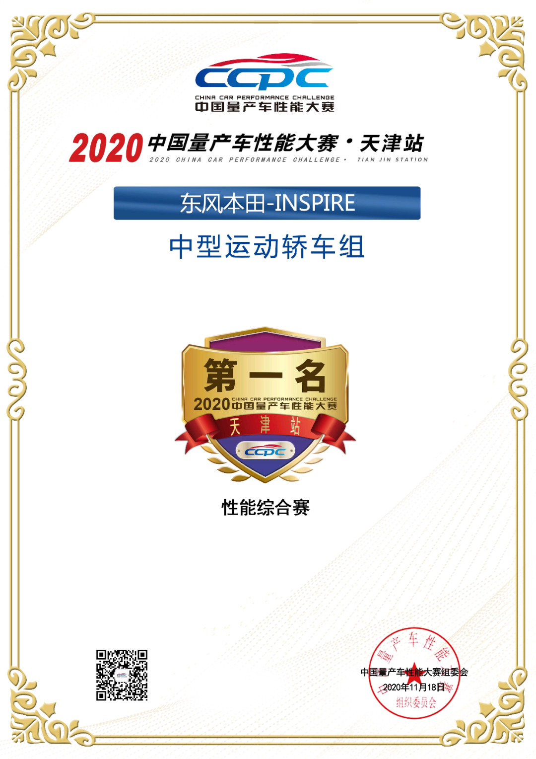 11月17-11月18日,2020年中国量产车性能大赛(CCPC)收官之战在这座充满激情的活力之城拉开帷幕。代表东风Honda出战的新精英旗舰座驾INSPIRE,在中型运动轿车组多项比赛激烈角逐中凭借优异的操控,夺得性能综合冠军,再现高光时刻!