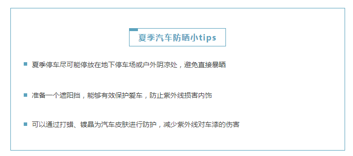 说了这么多的爱车晒伤现象,接下来小编为大家双手奉上夏季汽车防晒小tips,我们大家一起,好好防晒