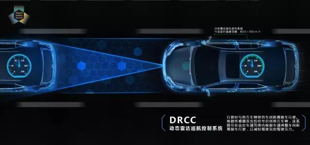 DRCC动态雷达巡航控制系统根据传感器发出的信号识别前方车辆,并在设定的车速范围内根据前车车速调整车间距离,跟车行驶从而减轻驾驶员的驾驶压力。